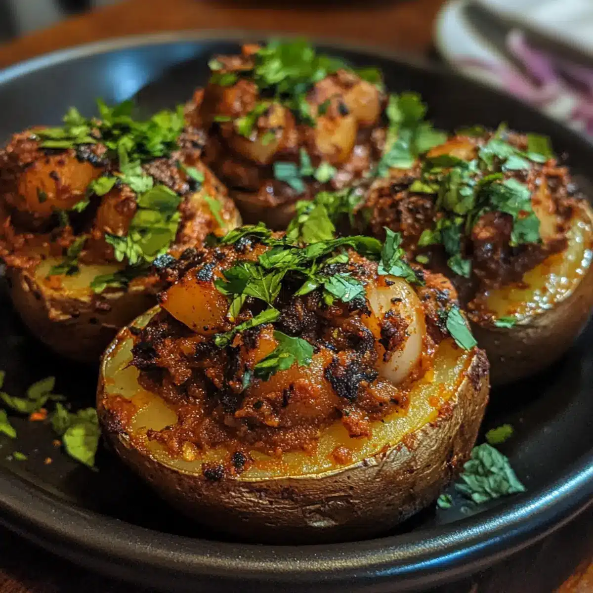 - Stuff Potatoes: Generously mound the beef masala into each potato shell, pressing lightly to fill every crevice.